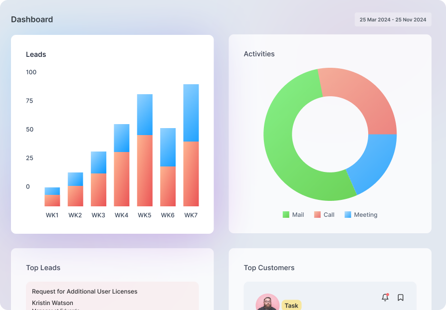 Our CRM system is designed to help businesses of all sizes manage customer relationships more efficiently. From tracking leads and automating sales to managing communication and support, it provides all the tools you need to streamline your operations and grow faster. With industry-focused features, it adapts to your specific business needs for maximum productivity and customer satisfaction.